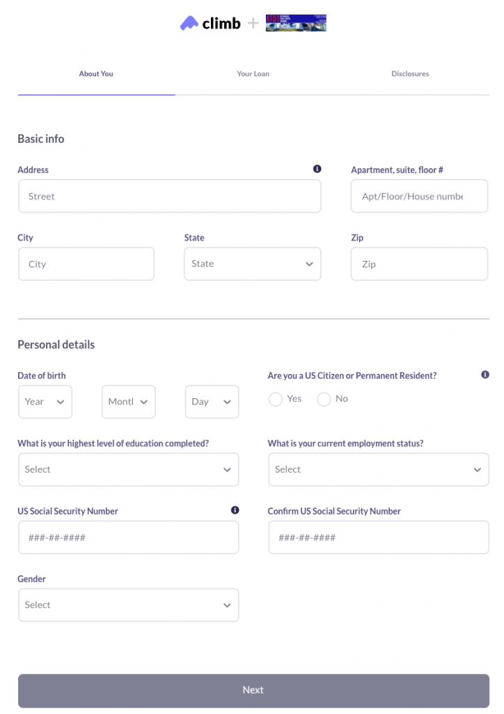 The screenshot below is of the third step in applying for a Climb Credit loan.