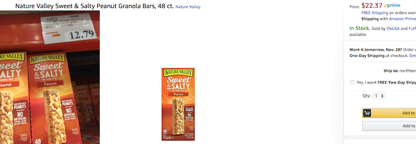 The price of Nature Valley Sweet & Salty Granola Bars (48 count) as featured on Amazon and at Costco (bottom left corner image). (note: Amazon price featured in picture may be different than price featured in table as pictures were screen-grabbed on Cyber Monday)