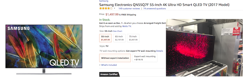 The price of a Samsung 55″ 4K TV as featured on Amazon and at Costco (bottom right corner image). (note: Amazon price featured in picture may be different than price featured in table as pictures were screen-grabbed on Cyber Monday)