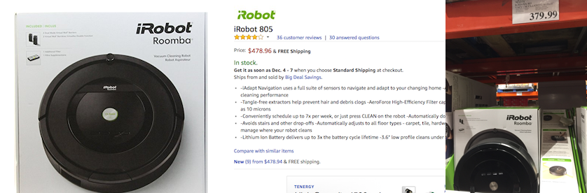The price of a iRobot Roomba 805 Vacuum Cleaning Robot as featured on Amazon and at Costco (bottom right corner image). (note: Amazon price in picture may be different than price featured in table as pictures were screen-grabbed on Cyber Monday)