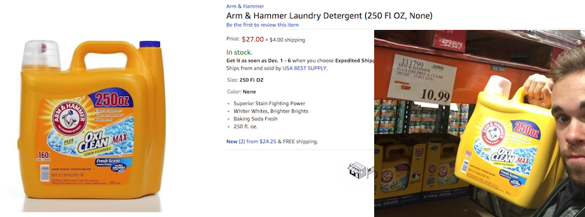 The price of Arm & Hammer Plus OXI Free and Clear Detergent (250oz) as featured on Amazon and at Costco (bottom right corner image). (note: Amazon price in picture may be different than price featured in table as pictures were screen-grabbed on Cyber Monday)