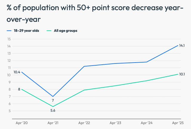 Around 14.1% of Gen Z borrowers experienced a decline of 50 points or more in their score this year. That substantial drop shows that many young adults could be feeling the squeeze.
