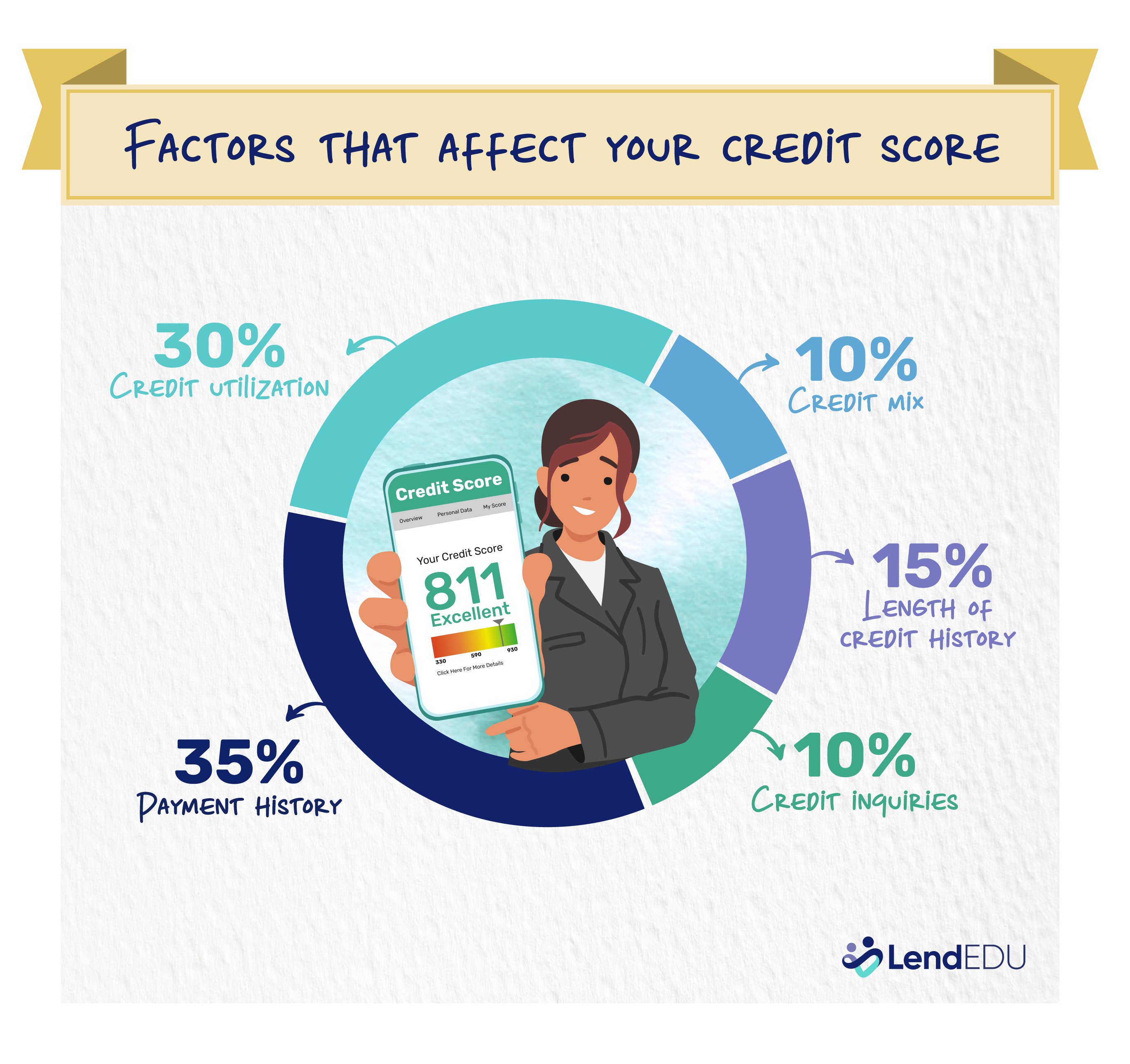 - Payment history (35%): Whether you pay your bills on time. This carries the most weight.
